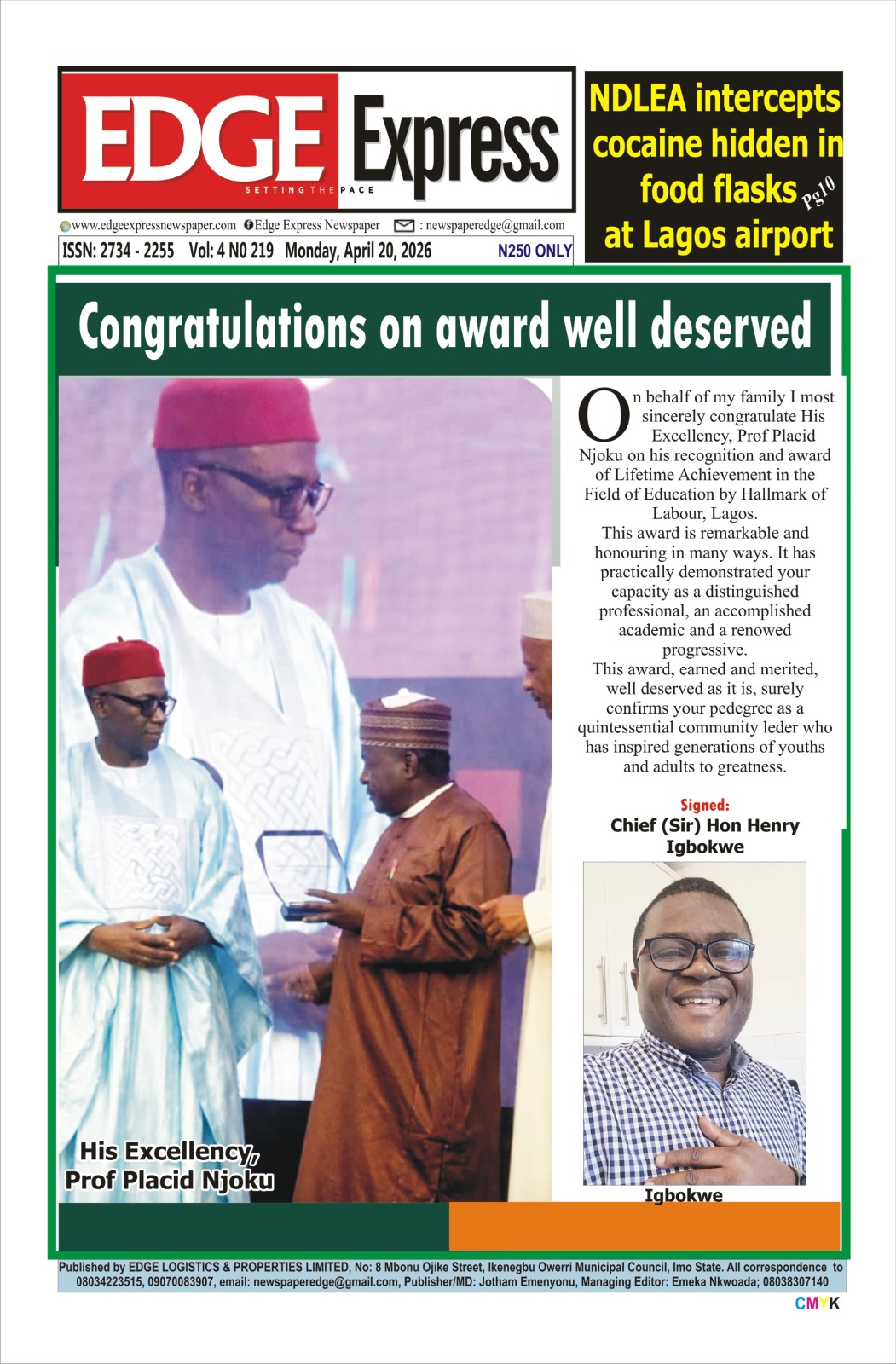 On behalf of my family I most sincerely congratulate His Excellency, Prof Placid Njoku on his recognition and award of Lifetime Achievement in the Field of Education by Hallmark of Labour, Lagos.